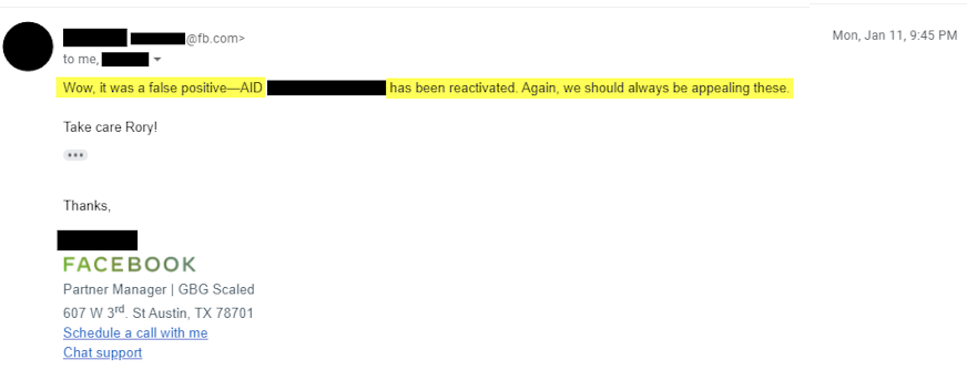 I've personally helped a division of the largest direct response company in the world restore their advertising privileges on Facebook.